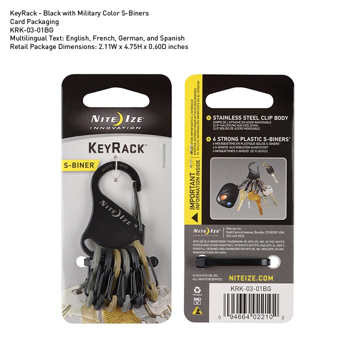 The Nite Ize KeyRack is as functional as it is compact, versatile as it is simple, and useful as it is (for lack of a better word) cool-looking. Its high quality stainless steel carabiner clip has a secure gate closure on one end, allowing you to clip your keys to an existing key ring, belt loop, purse strap, zipper pull-anything with a loop or D-ring. The other end holds six different-colored plastic S-Biners, perfectly sized to hold 6 separate keys. Identify your keys by color, and attach and release them individually from the Key Rack with ease. No more fiddling with split rings or fumbling to find the key you need-the Key Rack is perfect for quick and easy sharing of keys with family members, leaving a key for a valet or babysitter, and taking a single key when you're out on a run or ride.