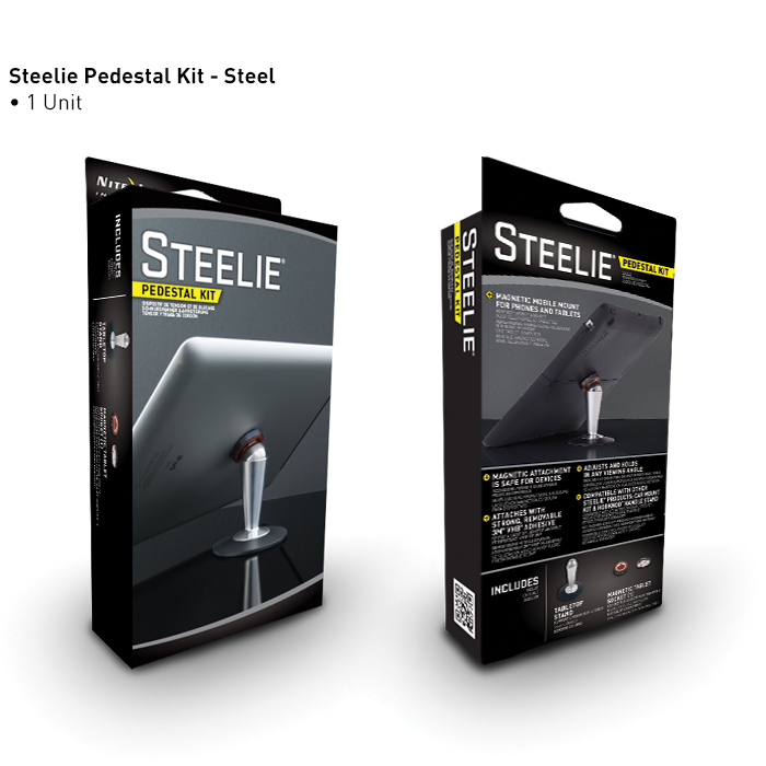 The Steelie Pedestal Kit is simple, versatile, and infinitely convenient. Its clean design and strong magnetic composition makes it easy to dock and re-dock your tablet on desks, countertops, tables, nightstands, floors - any smooth, flat surface. The Steelie Pedestal Kit uses two unique components to create this interactive viewing pedestal. The Steelie Tabletop Stand Component is a machined aluminum podium that fits tightly into a durable plastic base with silicone grips to create a stable platform. At the top of the stand is a steel ball which magnetically engages the Magnetic Tablet Socket to create the complete Steelie Pedestal Kit. The Magnetic Tablet Socket Component is also a strong, machined aluminum base that contains a powerful, circular magnet, ringed and centered with flexible silicone and backed with 3M®'s VHB™ adhesive foam tape. Simply peel and attach it securely to the center of the back of your tablet, or its rigid case. When magnetically connected to the Tabletop Stand, the Steelie Magnetic Tablet Socket's silicone sections create a smooth glide and firm grip, so you can easily rotate the device from landscape to portrait position and it stays that way until you turn it again.